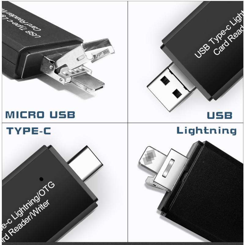 Sản phẩm với 4 cổng kết nối trong 1: USB, MicroUSB, TypeC, Lightning, hỗ trợ chức năng OTG và 2 cổng thẻ nhớ SD/TFcard giúp kết nối được với nhiều thiết bị, lưu trữ file đa dạng.