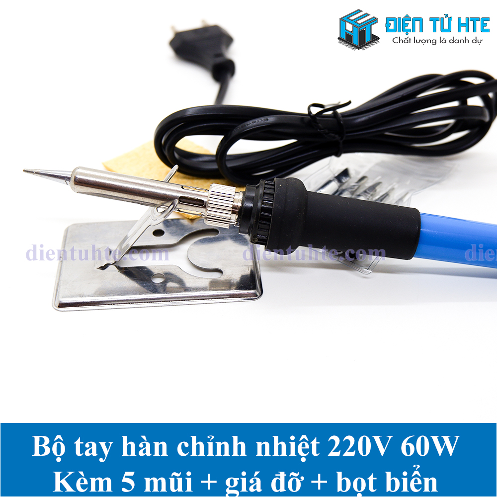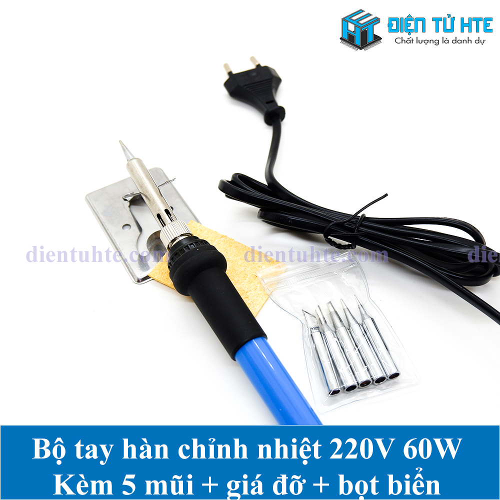 Bộ sản phẩm gồm: Tay hàn 60W, 5 mũi hàn 900M, giá đỡ kim loại, miếng bọt biển vệ sinh mũi hàn.