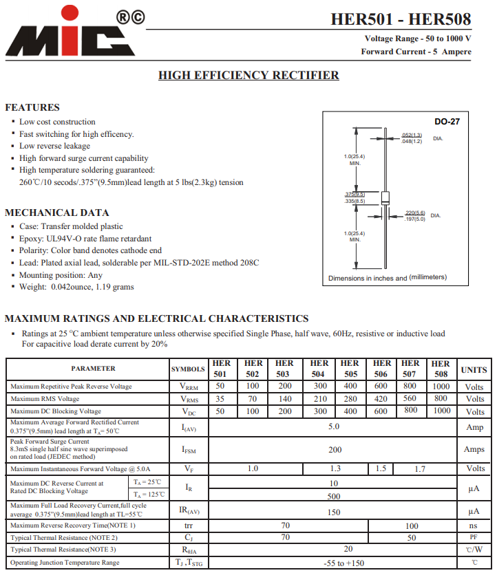 - Điện áp phân cực ngược lớn nhất: 1000V