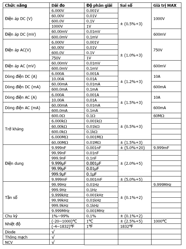 Bộ sản phẩm gồm: Đồng hồ, que đo, que đo nhiệt độ, Pin, Hướng dẫn sử dụng, Hộp carton.