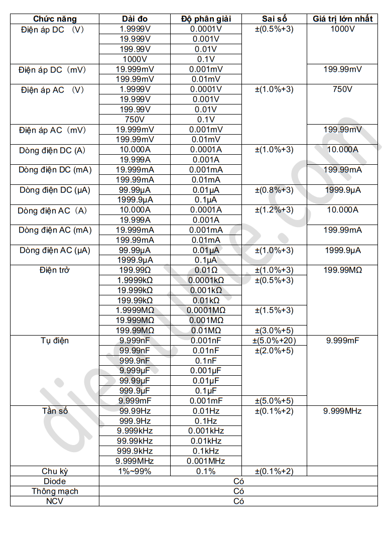 Thông số kỹ thuật (Xem bảng bên dưới)