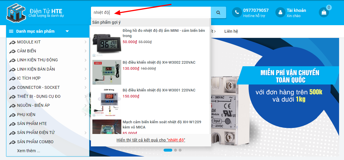 Bước 1: Truy cập website và lựa chọn sản phẩm cần mua để mua hàng bằng cách lựa chọn sản phẩm hiển trị trên trang chủ, hoặc chọn theo danh mục mong muốn hoặc gõ từ khóa cần tìm vào ô tìm kiếm, Hệ thống sẽ tự động hiển thị sản phẩm gợi ý khớp với từ khóa của quý khách:
