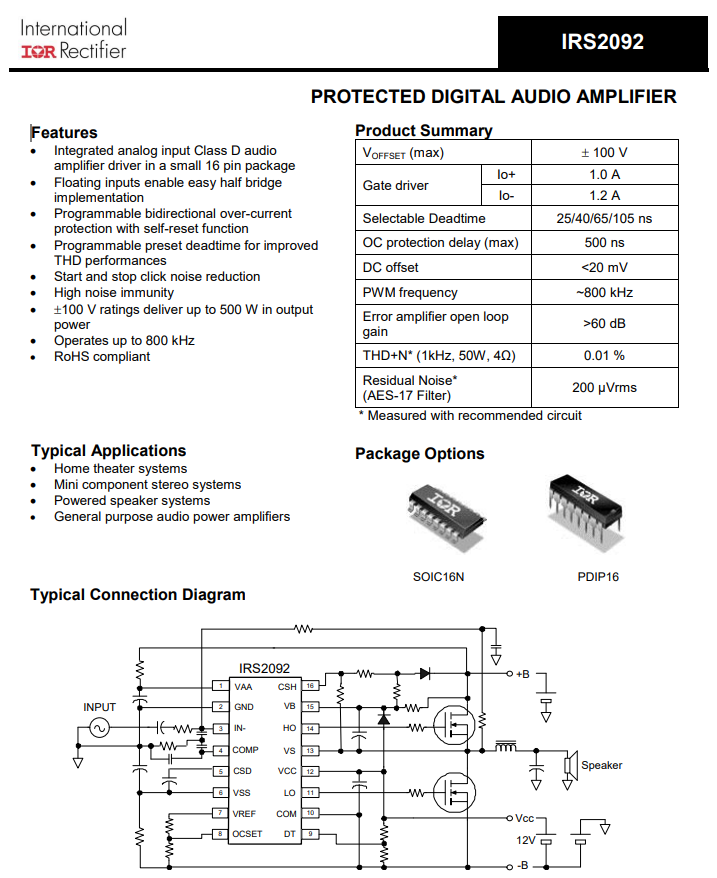 Là IC khuếch đại âm thanh kỹ thuật số Class D có bảo vệ, công suất đầu ra lên đến 500W ở mức điện áp 100V. Ứng dụng trong các thiết bị âm thanh