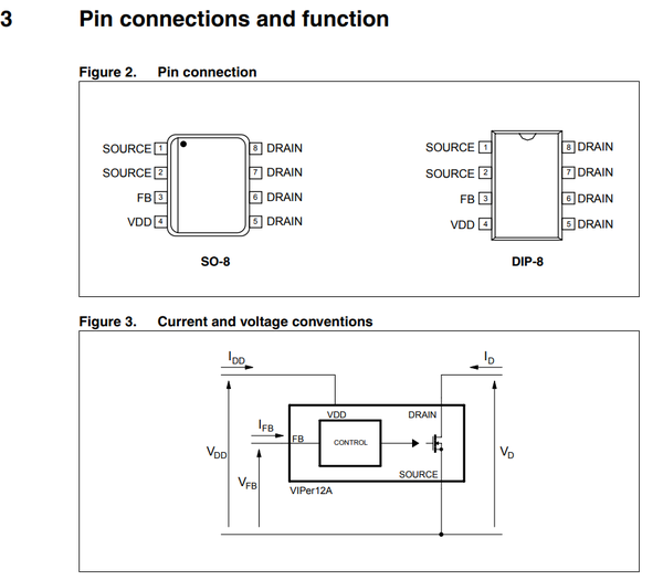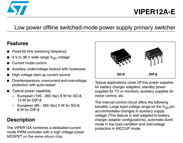 IC nguồn Viper12A có hai dạng đóng gói 8 chân là VIPER12A SOP-8 và Viper12A DIP-8. Công suất từ dao động 8W - 13W tùy dải điện áp.