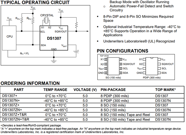 DS1307 là IC thời gian thực có công suất tiêu thụ thấp, hỗ trợ giải mã thời gian/lịch đầy đủ hệ số thập phân (BCD) với 56 byte NVRAM. Giao tiếp qua chuẩn giao tiếp I2C với đầy đủ thời gian, lịch.