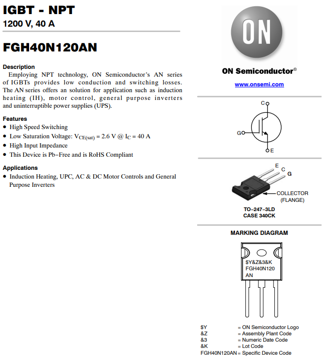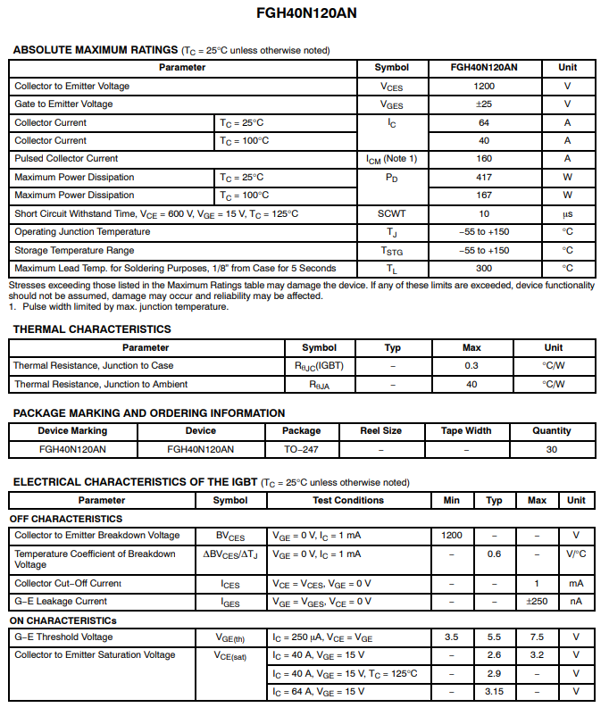 IGBT 40N120 là dòng IGBT công suất cao thường sử dụng đóng ngắt công suất trong bếp từ, máy hàn công suất lớn, UPS, Inverter.