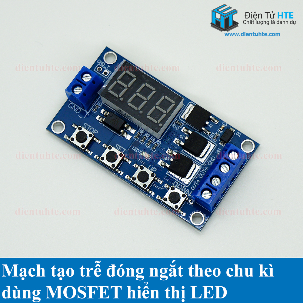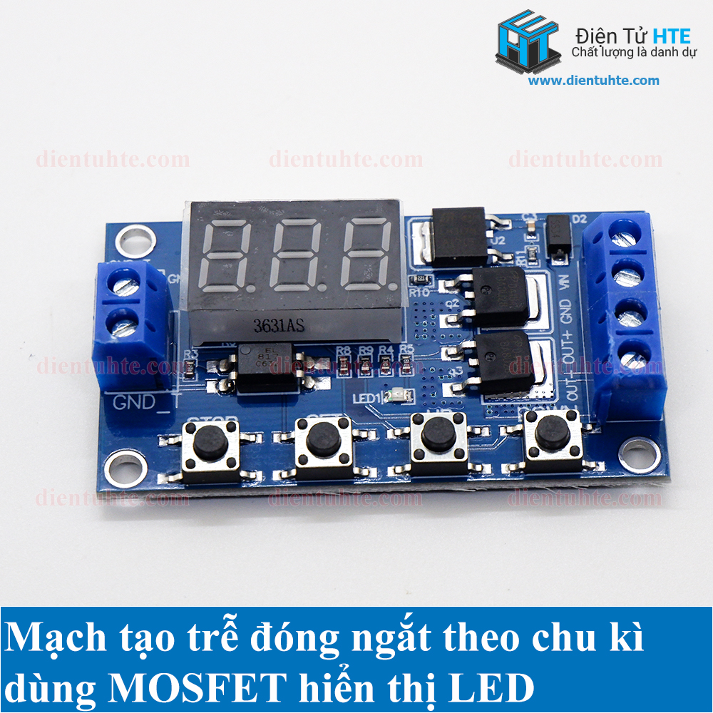 Mạch có chức năng cài đặt thời gian hoạt động theo chu kì với thời gian có thể cài đặt từ 0.1 giây đến 999 phút cho 1 lần ON, từ 0.1 giây đến 999 phút cho 1 lần OFF và từ 1 đến 999 chu kì đếm hoặc có thể cài đặt vòng lặp vô hạn.