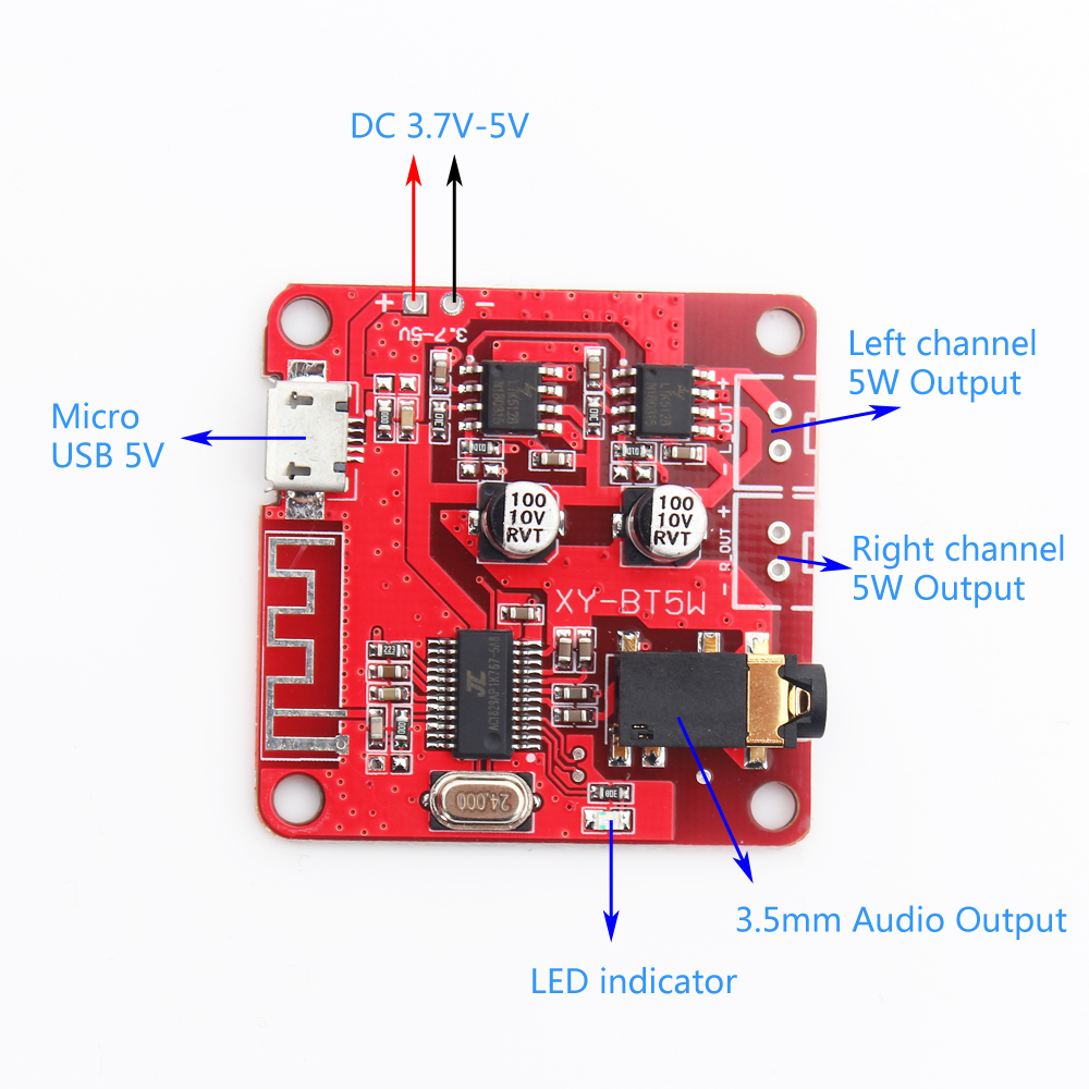 Mạch hỗ trợ công nghệ Bluetooth 4.2, điện áp đầu vào 3.7V đến 5V, hỗ trợ chức năng tự động kết nối lại, hỗ trợ khuếch đại Class D tối đa 5W trên mạch