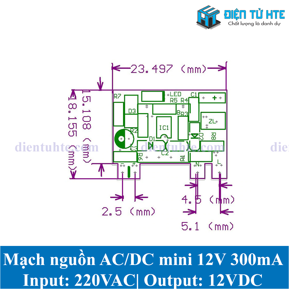 Module chuyển điện áp 220VAC sang 12VDC với dòng ra đạt 300mA và kích thước rất nhỏ gọn, thiết kế chân cắm vào PCB nên có thể sử dụng làm mạch nguồn nuôi cho các thiết bị điện tử cần dùng trực tiếp điện 220V.