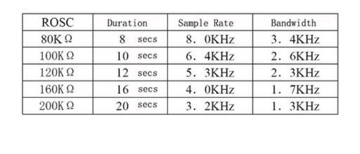 - Ghi âm tối đa được 10s (để thay đổi thời gian ghi, thay đổi giá trị R4 - Rosc theo bảng bên dưới)