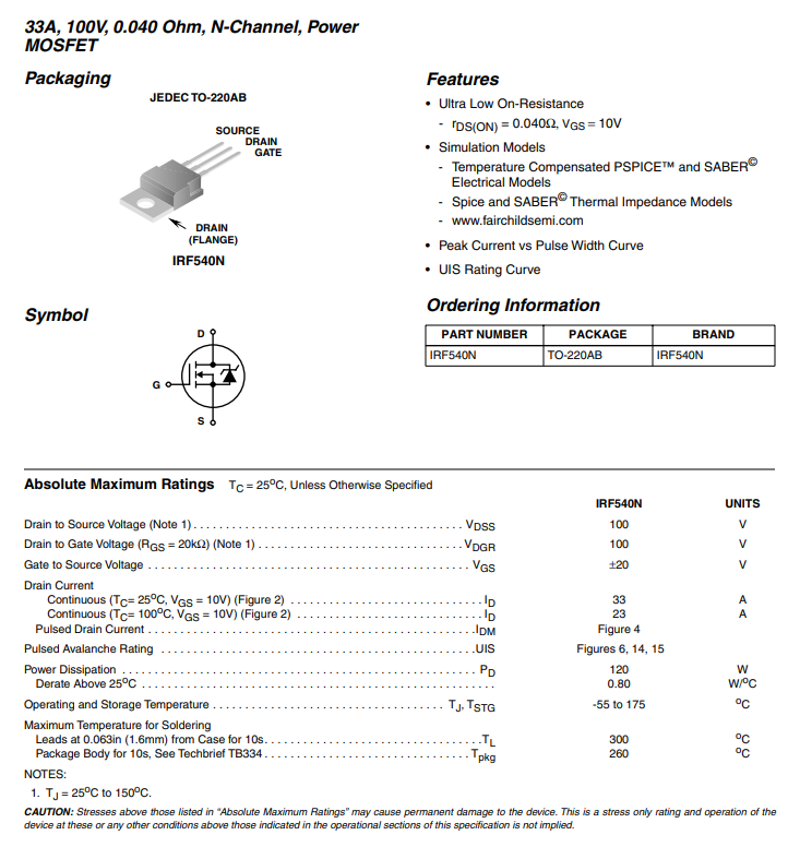 Mosfet công suất kênh N, N-MOSFET IRF540N 100V 33A TO-220AB