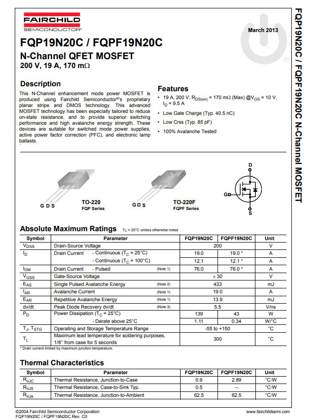 MOSFET Kênh N N-MOSFET FQP19N20C 19N20 19A 200V TO-220
