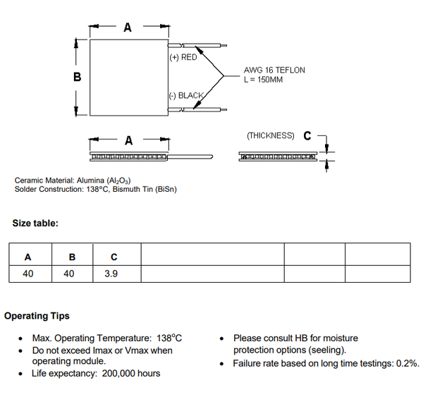 Sò nóng lạnh TEC1-12706 hoạt động với điện áp 12V và dòng tải tối đa 6A cho công suất làm lạnh 60W.