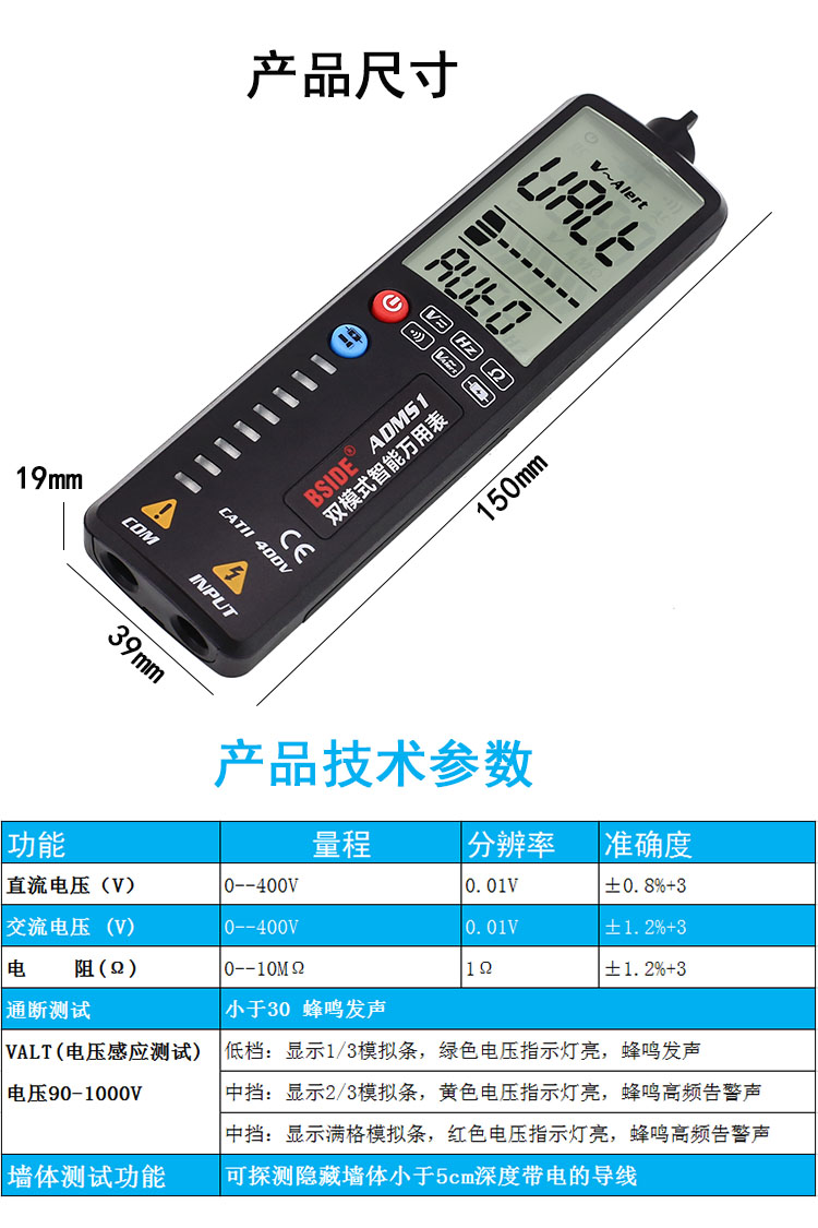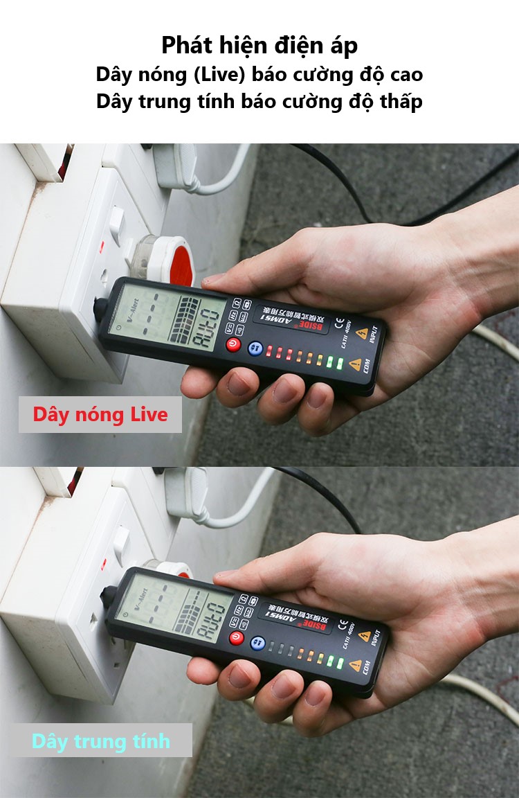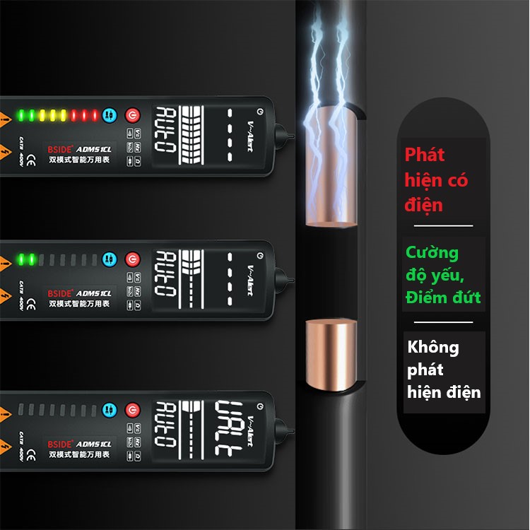 Thiết bị có chức năng phát hiện điện áp âm tường đến 5cm, kiểm tra điện không tiếp xúc NCV như là một bút thử điện không tiếp xúc và chức năng như một đồng hồ đo vạn năng kiểm tra điện áp, điện trở,...