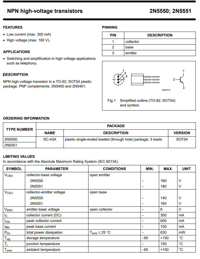 2N5551 là transistor NPN điện áp cao, tương thích với dòng PNP 2N5401, ứng dụng trong chuyển mạch và khuếch đại tín hiệu có điện áp cao như điện thoại để bàn có dây,...