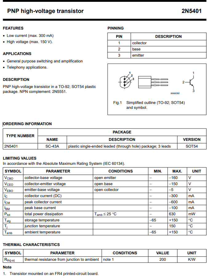 2N5401 là transistor PNP điện áp cao, tương thích với dòng NPN 2N5551, ứng dụng trong chuyển mạch và khuếch đại tín hiệu có điện áp cao như điện thoại để bàn có dây,...