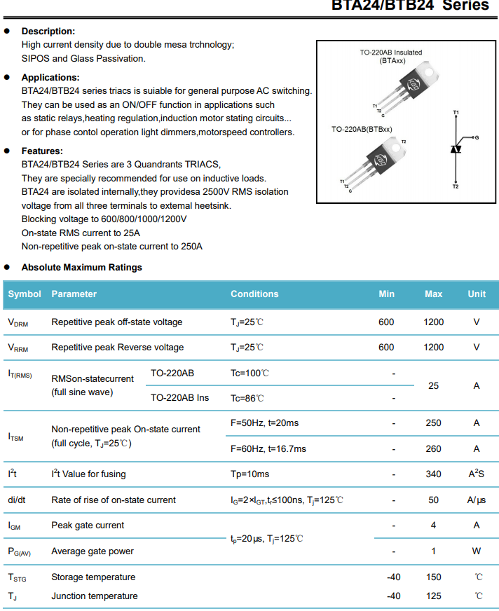 Triac BTA24-1000B với dòng tải đạt 25A, điện áp tối đa 1000V ứng dụng trong các mạch điều khiển điện áp AC, điều khiển tốc độ động cơ, dimmer